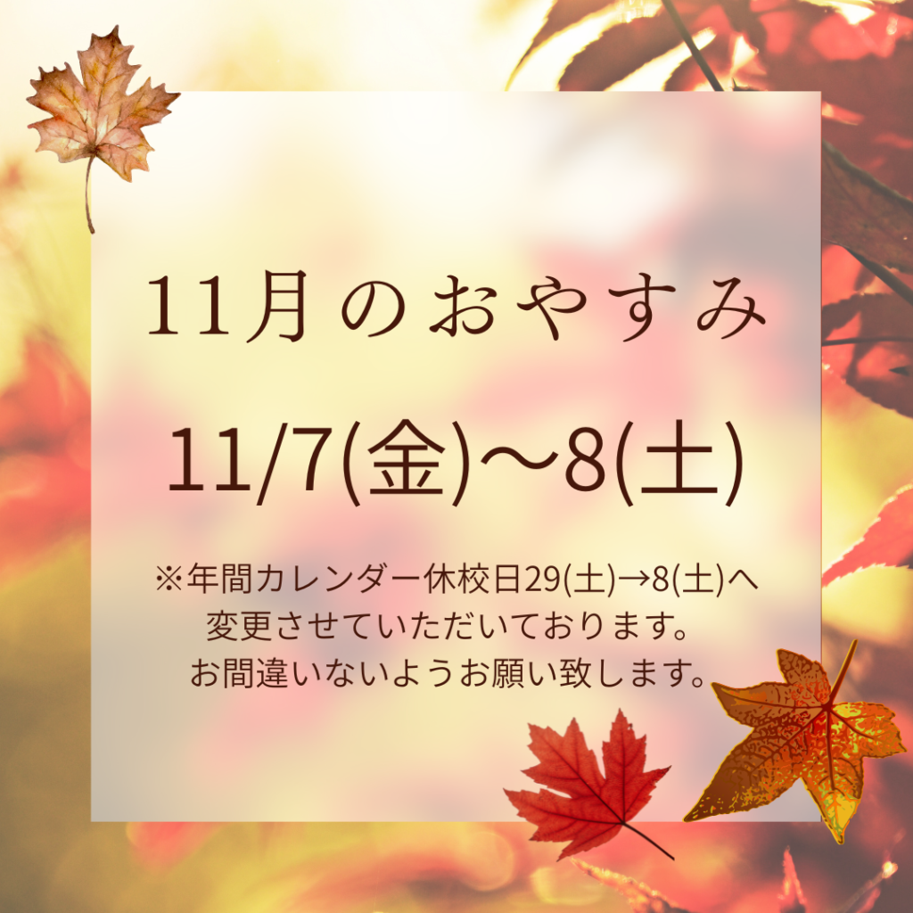 11月の休校日につきましては29(土)→8(土)へ変更させていただきました。